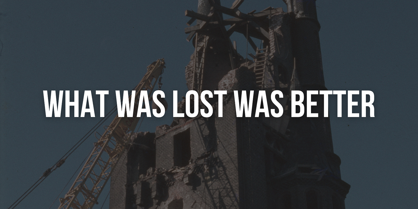 Each week an essay names something that was lost, dismantled, or quietly replaced. Craft, liturgy, architecture, comportment. You will learn to see what most people walk past.