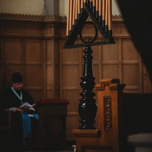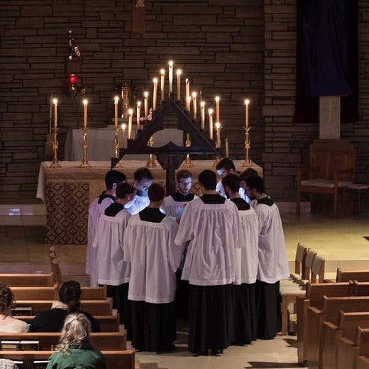 On Wednesday evening of Holy Week, the church went dark. Not gradually, not symbolically. Darkness spilled from the back, candle by candle, psalm by psalm, until the only light in the cavernous space came from a single triangular stand: fifteen unbleached candles, the same wax used for Requiem Masses.