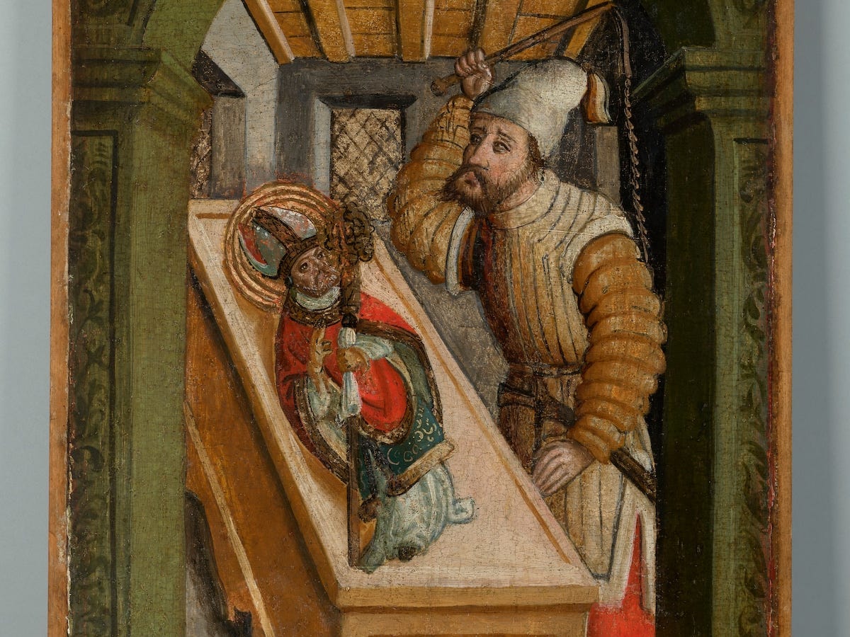 Nicholas of Myra was a fourth-century bishop in what is now Turkey. At the Council of Nicaea in 325, when the heretic Arius denied Christ’s divinity, Nicholas reportedly struck him in the face. So the other bishops stripped Nicholas of his vestments for this breach of decorum. That night, Christ and Mary appeared to several bishops in dreams, commanding them to restore Nicholas. The vestments were returned.